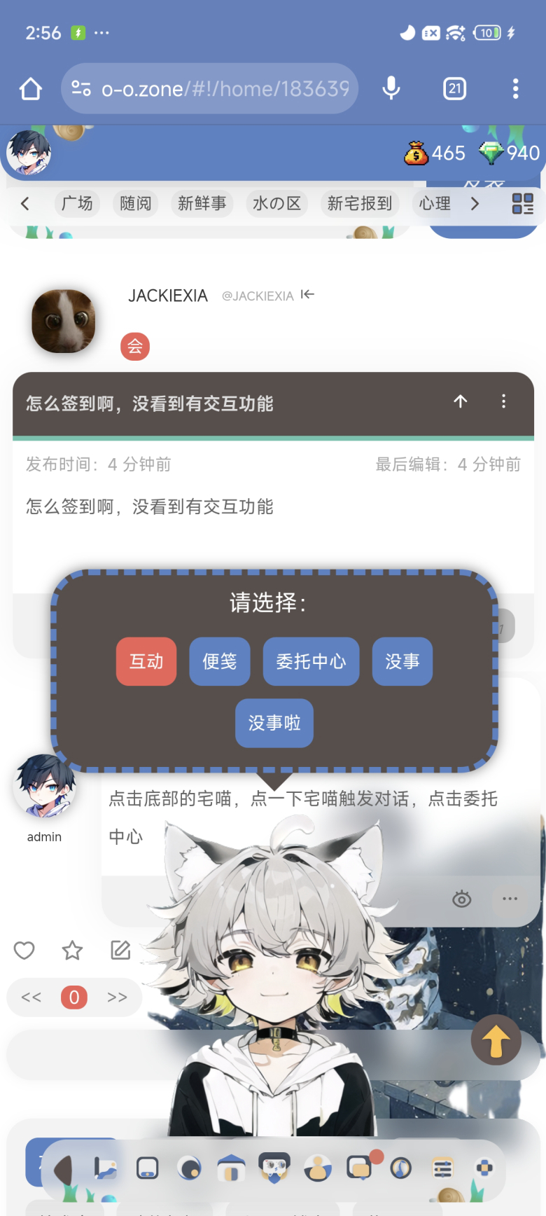 点击底部的宅喵,点一下宅喵触发对话,点击委托中心