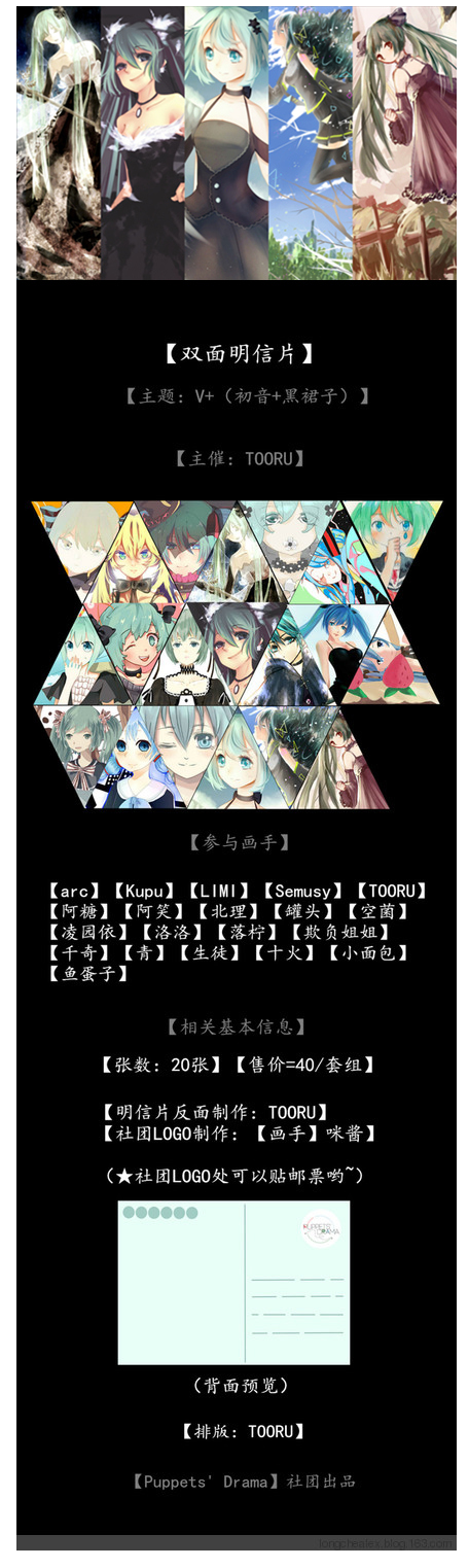 这个是自家社团【Puppets’Drama】(中文翻译:木偶话剧社)出品的同人主题明信片里自己参的稿子。【主题:初音+黑裙子】目前限于网售。【20张/套组/40RMB(不包邮瞩目)】【淘宝预售页面:http://item.taobao.com/item.htm? ... 4Zda&id=41017444512】(请根据商品详情所写进行购买,祝购买愉快www)