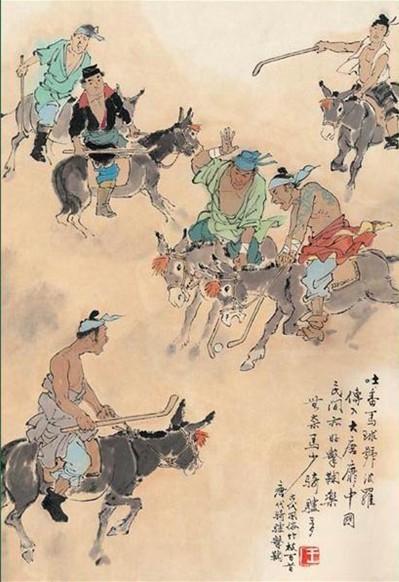 马球藏语称波罗。在唐初传入长安后,即为皇帝和贵族们所喜好。盛行情况可见《封氏闻见记》。尤其到唐玄宗时,打马球风气大盛。波罗球大如拳头,用坚韧木料制成,内部挖空,外面涂色或装饰。故又称“朱球、画球、彩球、七宝球”等。球杖长数尺,击球一端呈弯月形。球场宽阔平坦,两端各有球门,两队球手骑马入场,打入球门为胜得一筹,将筹插在球门上。当时也有在大街上打球者,也有骑驴打球者。如《逸史》载:李林甫“年二十,尚未读书。在东都,好游猎打球,驰逐鹰狗,每天城外槐坛下,骑驴击球,略无休日。既惫舍驴,以两手返据地歇。”后来也有步行打球者,如王建《宫词》:“殿前铺设两边楼,寒食近人步打球。一半走来争跪拜,上棚先谢得头筹。”