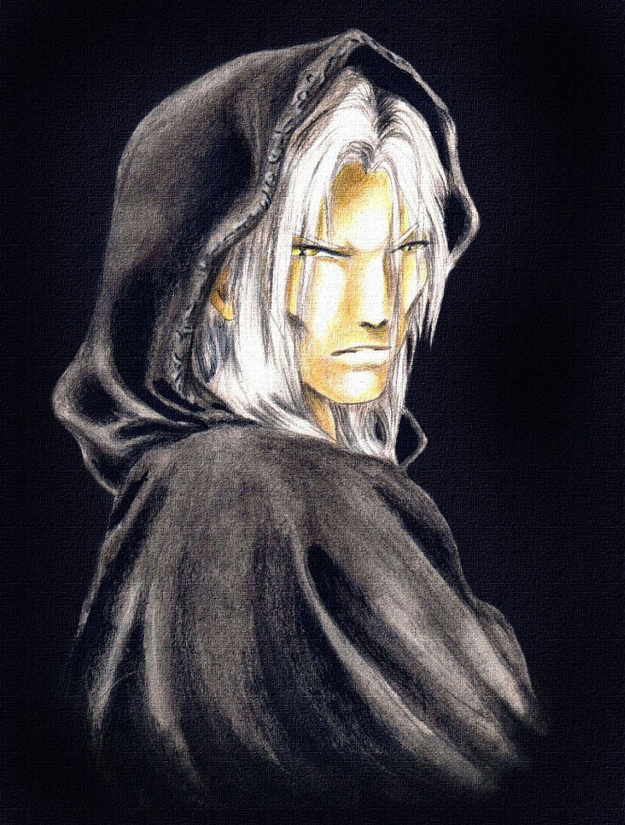 特征:终年裹着黑色的法师长袍,表情深深隐蔽在兜帽之下。淡金色的皮肤散发着黯淡的光芒,苍白的头发,枯瘦病态的脸庞活像无底深渊里爬出来的丧尸。就连眼睛也不像任何活物——深邃的沙漏状的瞳孔散发着诡异的金色光芒,可以清晰地看到时间的流逝。随时发作的咳嗽让他长期弓着背,勉强依靠着玛吉斯法杖支撑身体,似乎随便一阵轻风都可以让他命丧黄泉。然而在长长的法师袍下,一颗叛逆、冷酷的心却在强有力地跳动,瘦弱的身体中隐藏着与其健康不相符的魔法力量……