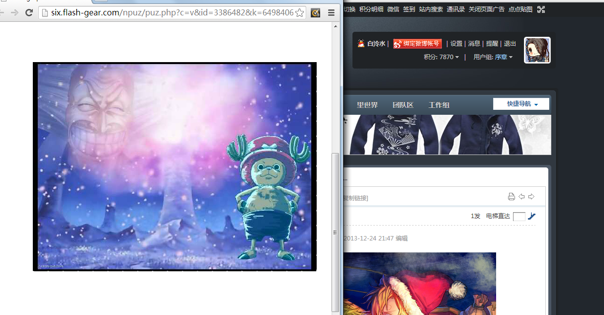 说明:1、禁止大号和马甲用同一张图,如果发现的话记得只给其中一个号发奖励,或者小号可以拼不同级别的图。2、按照困难系数不同奖励不同 具体请看拼图名称后的标注奖励。3、请从中选取一张完成,若多拼则最后只会按最高奖励奖赏。4、请按要求截图(开启两个浏览器窗口,把你完成的拼图和技宅信息栏截在一起),否则木有糖吃。[fold=截图例子戳我]开启两个浏览器窗口,把你完成的拼图和技宅信息栏截在一起[/fold]