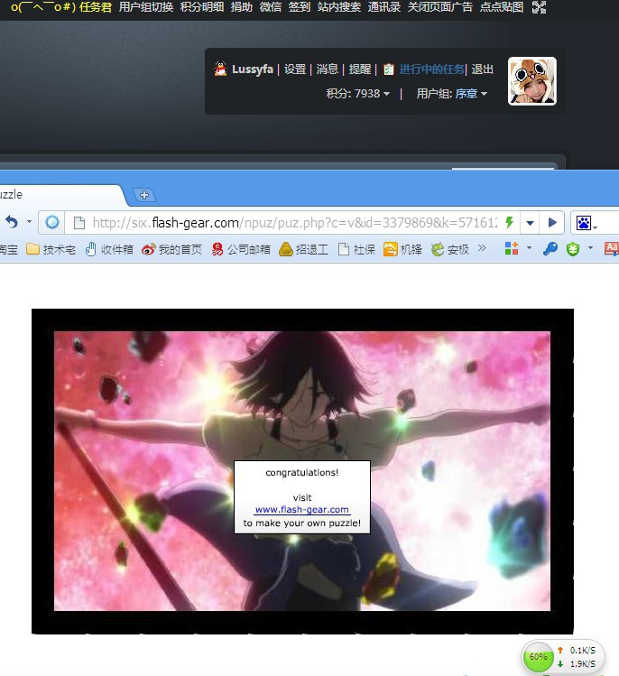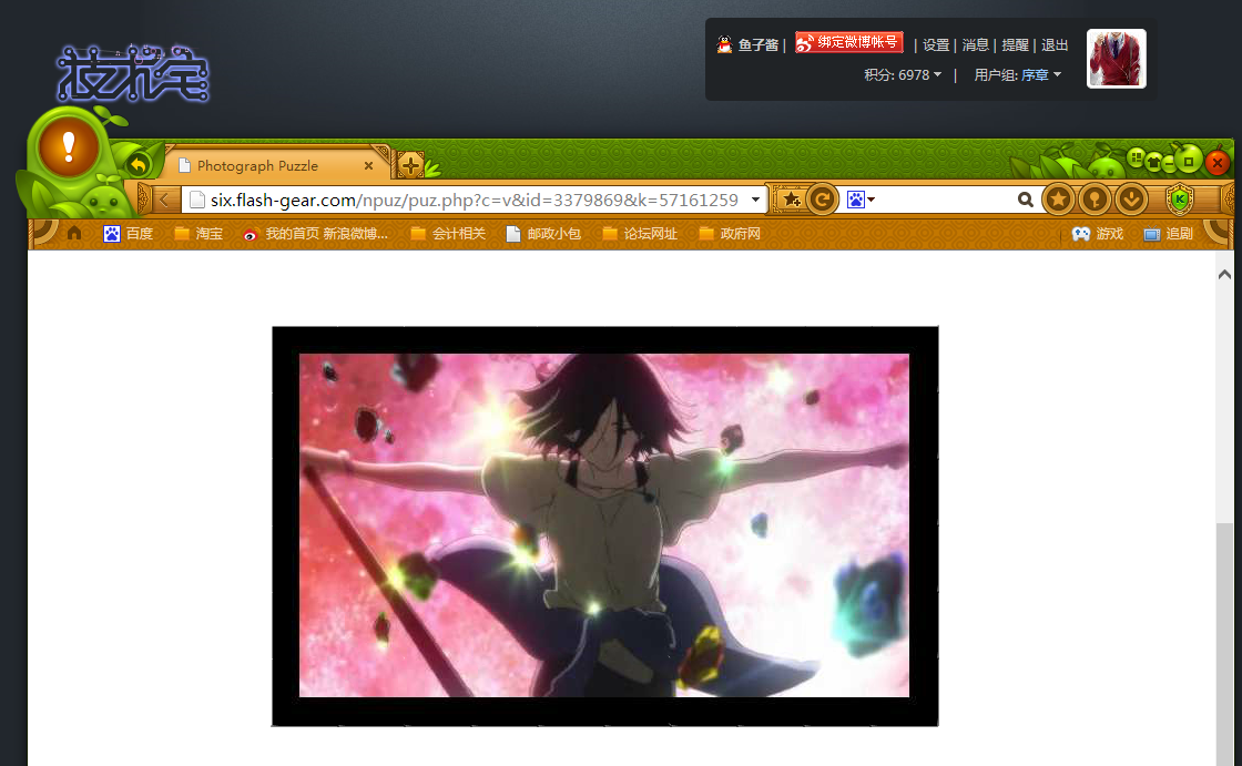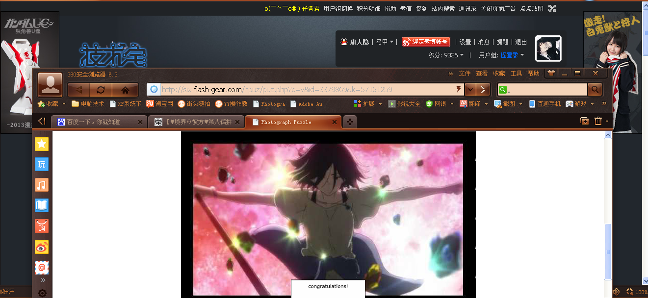 说明:1、禁止大号和马甲用同一张图,如果发现的话记得只给其中一个号发奖励,或者小号可以拼不同级别的图。2、按照困难系数不同奖励不同 具体请看拼图名称后的标注奖励。3、请从中选取一张完成,若多拼则最后只会按最高奖励奖赏。4、请按要求截图(开启两个浏览器窗口,把你完成的拼图和技宅信息栏截在一起),否则木有糖吃。[fold=截图例子戳我]开启两个浏览器窗口,把你完成的拼图和技宅信息栏截在一起[/fold]