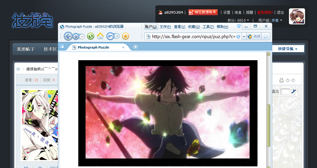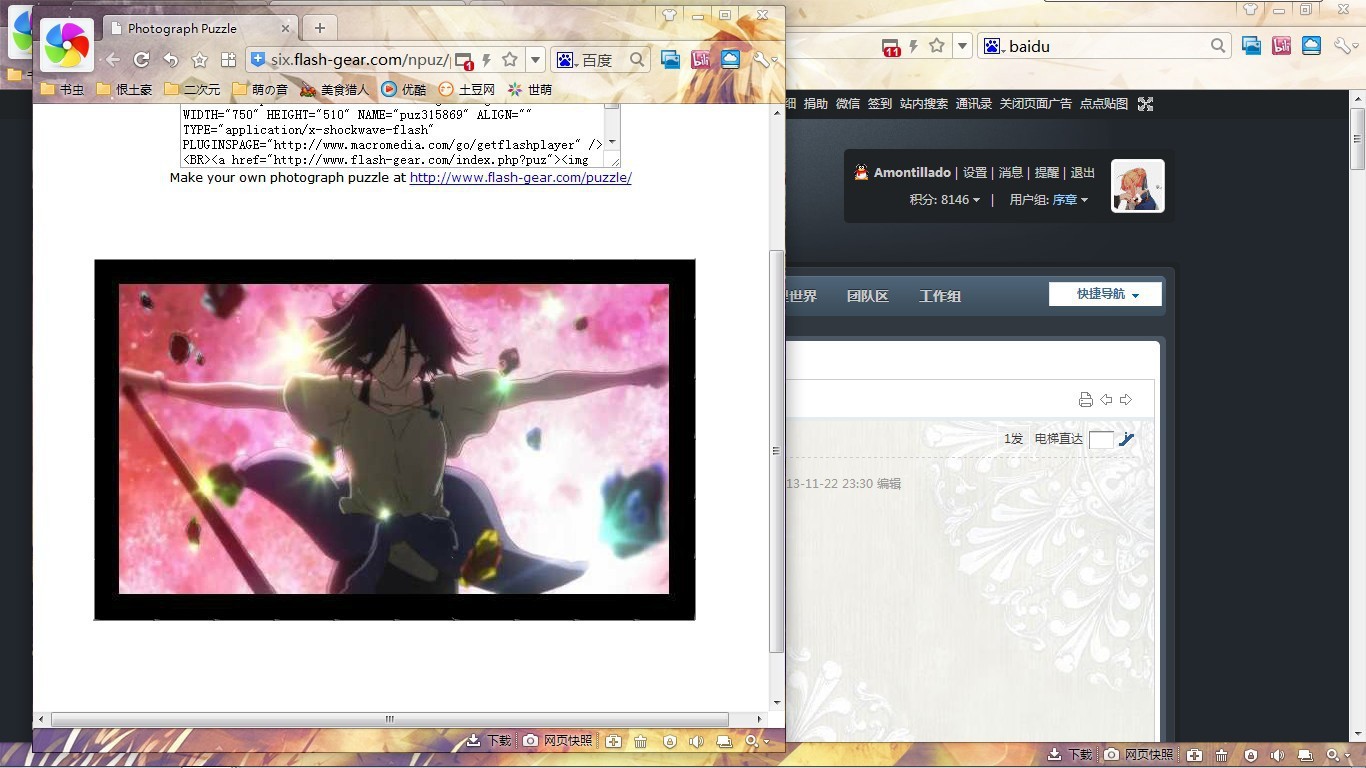 说明:1、禁止大号和马甲用同一张图,如果发现的话记得只给其中一个号发奖励,或者小号可以拼不同级别的图。2、按照困难系数不同奖励不同 具体请看拼图名称后的标注奖励。3、请从中选取一张完成,若多拼则最后只会按最高奖励奖赏。4、请按要求截图(开启两个浏览器窗口,把你完成的拼图和技宅信息栏截在一起),否则木有糖吃。[fold=截图例子戳我]开启两个浏览器窗口,把你完成的拼图和技宅信息栏截在一起[/fold]