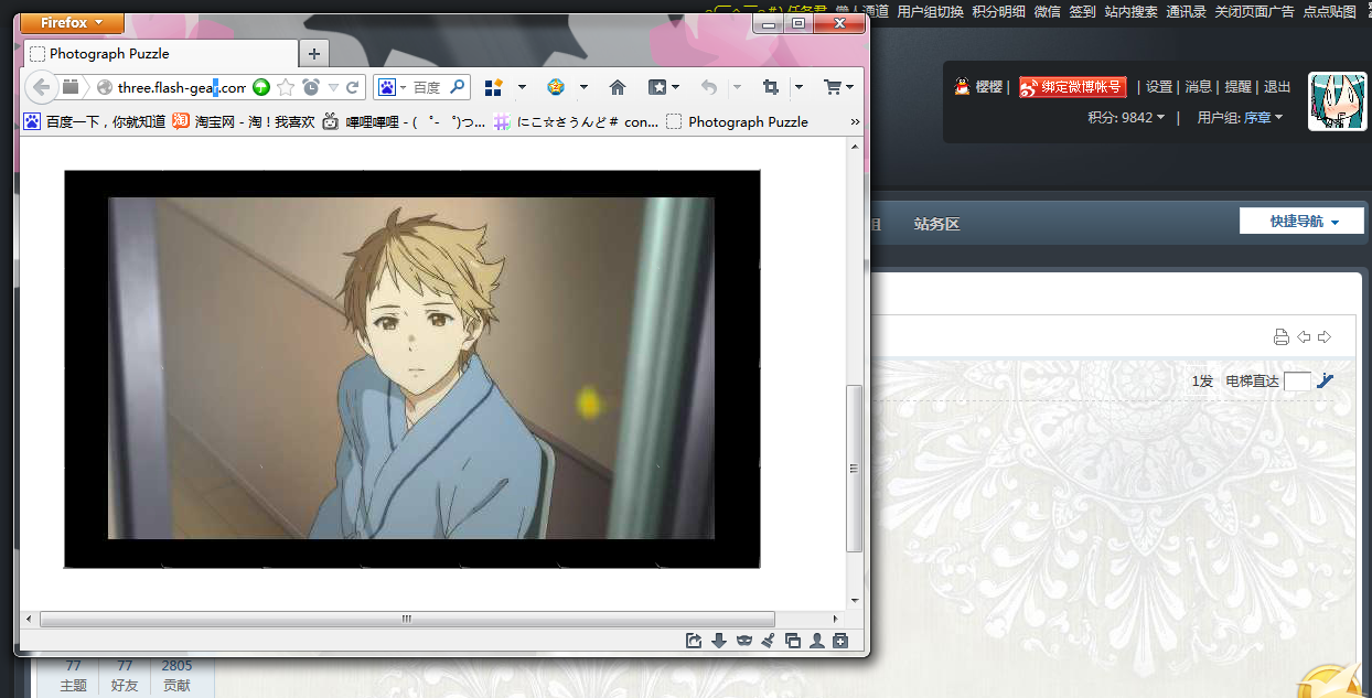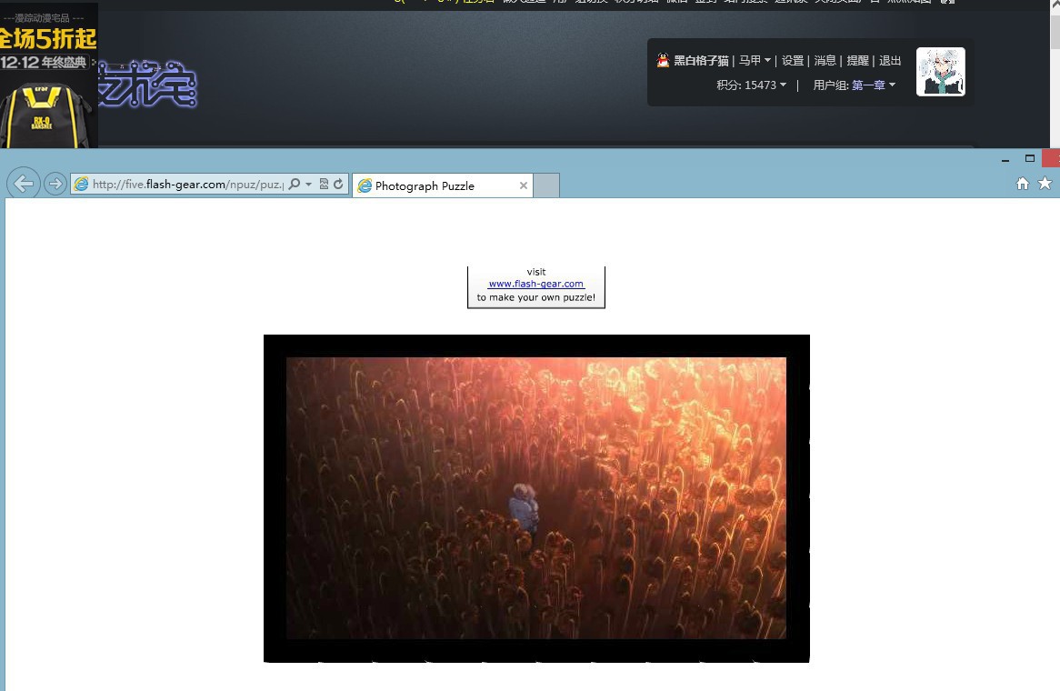 说明:1、禁止大号和马甲用同一张图,如果发现的话记得只给其中一个号发奖励,或者小号可以拼不同级别的图。2、按照困难系数不同奖励不同 具体请看拼图名称后的标注奖励。3、请从中选取一张完成,若多拼则最后只会按最高奖励奖赏。4、请按要求截图(开启两个浏览器窗口,把你完成的拼图和技宅信息栏截在一起),否则木有糖吃。[fold=截图例子戳我]开启两个浏览器窗口,把你完成的拼图和技宅信息栏截在一起[/fold]