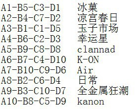 欢迎大家来到樱花坡新年庆典活动本次活动分为三部分:热场、挑战、决赛恭喜各位子板环节挑战成功者回到主版,参加最后的决赛╮(╯▽╰)╭嘛,都说主版的热场太简单不畅快那我努力下,出一些难的题目吧✪ω✪【喂!!】活动规则本部分包括四部分,请将属于同一动画的各部分连线第一部分:动画人物校服;第二部分:动画OP&ED;第三部分:动画场景;第四部分:动画LOGO完整的答题方式示例:A1-B1-C1-D1奖励详情此环节积分10连出完整的一条线8宅币,连出完整的十条线附加10宅贡[fold=额外大礼包]此部分结束后,统计本庆典三部分活动积分