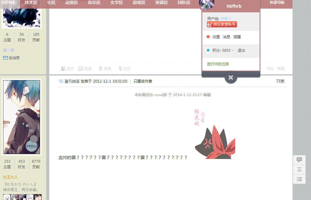 截图必须包含帖子标题、楼层、找到的宝藏和个人信息四个内容,如下图例所示(每个版块的宝藏图各不相同)。