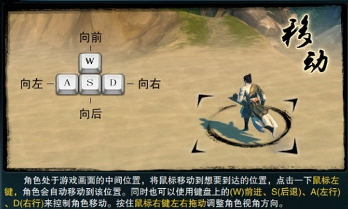 笑傲江湖中人物角色的移动可以通过鼠标点击画面中想到达的位置进行移动也可以通过键盘上的WASD控制配合鼠标进行移动,按住鼠标右键并拖动可以调整角色视角方向。
