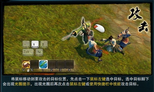 将鼠标移动到要攻击的目标位置,先点击一下鼠标左键并选中目标,选中目标的脚下会出现光圈提示,此时点击鼠标左键或使用快捷栏中的相应技能即可攻击目标。