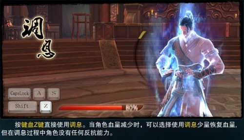 按键盘中的Z键即可进行调息,当角色血量减少时,可以通过调息恢复少量血量,但在调息过程中角色没有任何反抗能力,战斗中慎用。