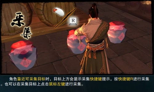 当角色靠近可采集目标时,目标上方会显示采集快捷键的提示R,这时按快捷键R进行采集也可以在采集目标上点击鼠标左键进行采集,怪物物掉落的物品也可以使用R键进行拾取。