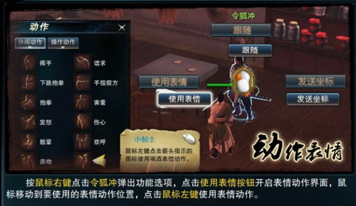 当鼠标右键选中目标时会弹出功能选项,点击“使用表情”按钮开启表情动作界面,鼠标移动到要使用的表情动作位置,点击鼠标左键即可使用表情动作。
