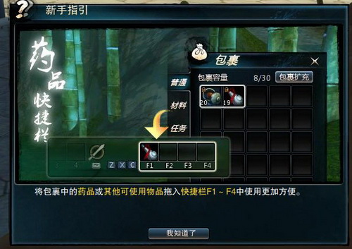 将包裹中的药品或其他可使用物品拖入快捷栏F1~F4中使用更加方便。