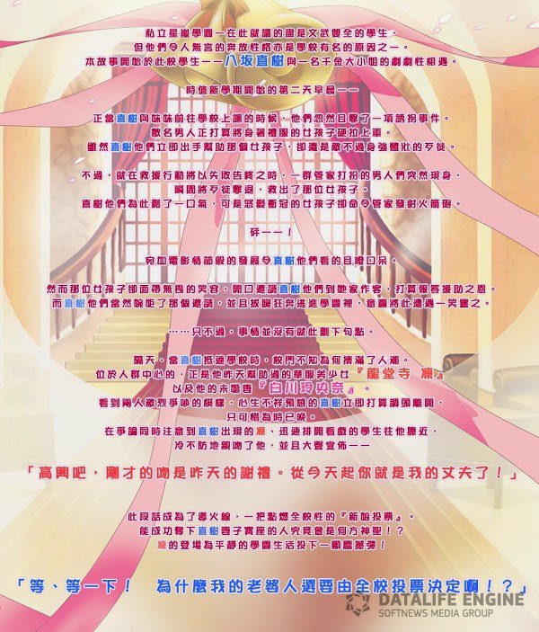 以聚集着学业·运动都很优秀、但同时自由放荡到令人吃惊的学生们而闻名的私立星岚学园(しりつせいらんがくえん)。故事就从就读于该校的八坂直树与一位十分了不得的大小姐的邂逅开始。那是新学期开始后第二天的早上—— 直树和妹妹等人一起上学,突然就在眼前发生了事件。数名男子将一位身穿礼服的女孩子硬是往车里推的诱拐剧。直树他们见状,马上上前去搭救女孩,但诱拐犯全都身强力壮,救援以失败告终。但就在这时,不知从哪出现了几位管家,转眼间就将诱拐犯击退并救出了少女。直树他们看到救援成功都松了一口气。但身边表情愤怒的女孩子却命令管家发射火箭炮。于是一阵爆炸气浪——直树等人对这极具冲击性的发展目瞪口呆。但女孩子理所当然般地露出了无畏的微笑,这次又为了感谢直树等人出手相救而招待他们到自己家。当然,直树等人拒绝了邀请并极力逃走。终于悄悄逃到了学园,直树等人对早上被卷入的麻烦事一笑而过。 ……但是,故事并没有就此结束。翌日,直树上学的时候不知为何校门前聚集了许多人。站在人群中间的,正是昨天救下的礼服装美少女·龙堂寺凛和许婚的 白川玲央奈。看上去似乎在进行激烈地争吵,预感不妙的直树马上试图折返,但为时已晚。争吵途中觉察到直树的凛,穿越各种围观群众靠近过来,突然就接吻并宣言。「尽管高兴吧,刚刚的吻是昨天的谢礼。我要让你成为我的丈夫!」于是乎以这个宣言为导火索,卷入整个学园的“新娘投票”开始了。究竟谁能成为直树的新娘!?在前面等着的是鬼还是蛇!?以凛的登场为契机掀起波澜万丈的学园生活拉开帷幕!「等、等等!为什么我的新娘要由学园投票来决定呀!?」[查看全文]