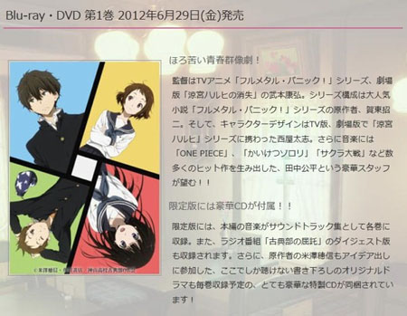 由著名动画商京阿尼制作的4月新番《冰菓》,集结了中村悠一、佐藤聪美、阪口大助、茅野爱衣、置鲇龙太郎、丰崎爱生、小仓唯、入野自由、山崎巧等人气实力派声优出演。虽说本作尚未播出,但其超级的制作班底以及声优阵容已让广大粉丝备受期待。今天,官网更新中公开了本作BD/DVD的消息。