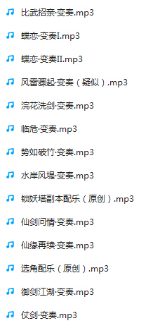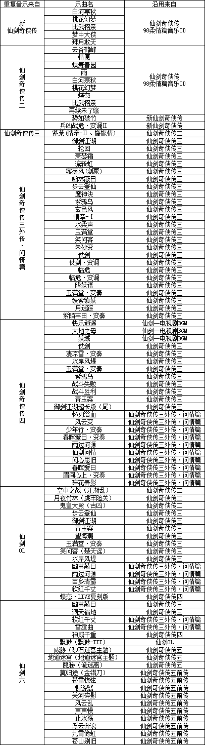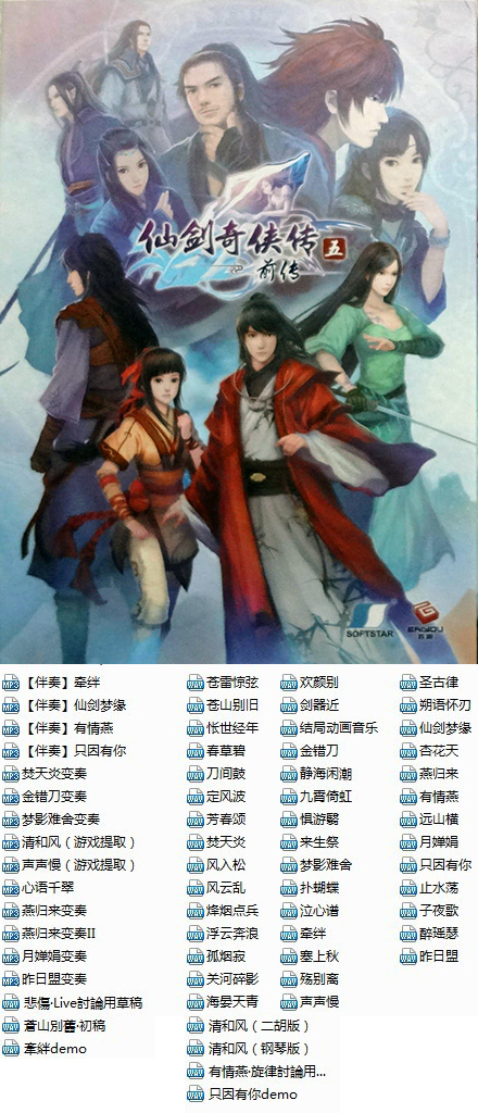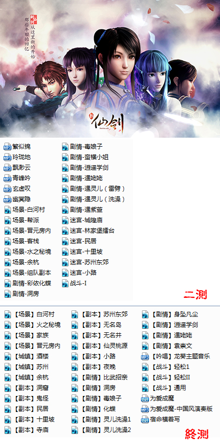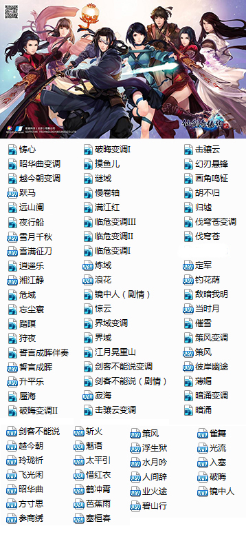 整合部分:整合《新仙剑奇侠传online》目前公布的所有BGM、主题曲《为爱成魔》《宿命横着写》;整合《仙剑客栈》网剧官方已公布BGM21首、主题曲《时间》《欠我的梦》《花下舞剑》及其伴奏(4首);整合仙六豪华版附赠精选历代曲目CD;整合《豪志曾经》第一卷部分曲目;整合台版仙六豪华版音乐碟30首曲目、历代精选曲目;新增部分:新增《仙剑奇侠传六音乐全收录》,包含仙六豪华版CD25首音乐全、光碟未收录其他音乐55首、官方主题曲《浪花》《誓言成晖》;新增《仙剑奇侠传逍遥游》卡牌主题曲《浮梦逍遥》;新增仙五部分两首《仙缘再续》变奏、一首CG音乐《封印魔君》;新增仙剑五前传手游(畅游)主题曲《三生叹》1首;新增仙剑外传手游音乐《群山飞鹤》(变奏);新增手游幻璃镜宣动一BGM;新增新仙剑奇侠传主题曲《有你的天堂》;新增新仙剑奇侠传online主题曲《为爱成魔》中国风演奏版(转格式);修改部分:修改了五前一首曲名修改提升了部分曲目音质至无损;仙六配乐《破晦》在音乐集中对应曲子与游戏中不一致,经询问,音乐碟中曲子确定为《破晦》原曲,游戏中名为《破晦》的曲子应为变调。至于是变调I或者变调II,未知。注:未整合《仙籁情深》、未收录仙一舞台剧音乐集。因为音质和重复较多的的原因,手游只留一首《群山飞鹤》变奏,没有收录其他的BGM,有需要的请私下联系我。这里有个重复音乐的对照表,方便大家找音乐!!!!重复的话我只保留前代的哦!!!