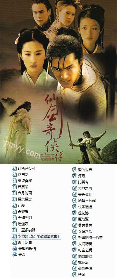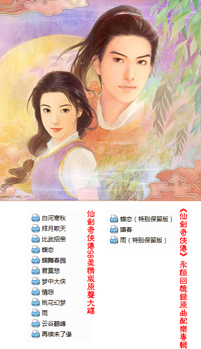 《仙剑客栈》网剧《仙剑奇侠传》舞台剧《仙剑奇侠传幻璃镜》(《仙剑奇侠传SS版》木有找到合适的解包器,希望有解包方法的童鞋和我分享一下!!还有三剧的背景音乐!!谢了!!:65:)终于整理完了!!!!话说有点小成就感呢~~其实之前在整理仙剑系列的台词和物品资料,做音乐资源算是中途放松吧,毕竟看字多了很累。这个资源我收集、整理、筛选、上传花了近3天的功夫,所有的音乐文件都由我亲自把关,筛选同一首曲子最佳的音质。仙剑历代都有沿用前代曲子的惯例,为了避免重复,我把重复的曲子删除了,只保留前代的那个(比如仙三的三外重复的曲子较多:39:),要是有遗漏的大家记得告诉我哦!DOS版和98柔情版的曲子因为是mid和rix的,转换成wav无损格式声音会有失真,所以我传了源文件提供下载,大家可以根据自己的喜好选择。所有的歌曲我都是分开每个音乐夹的,这利于我更新修改,也利于大家选择自己喜欢的或者没有的下载。[PAL_Music.Collection][1998]《仙剑奇侠传WIN95版(九八柔情篇)音乐CD》这张专辑上网搜了一下,貌似有95和98各一版,我是下载音轨然后自己分割的,因为98版的包括95版8首还多了四首,所以这里就只提供98版的下载啦。《仙剑奇侠传二·深冬的温柔》音乐选辑《仙剑奇侠传三》音乐光盘《仙剑奇侠传三》未公开音乐珍藏集《仙剑奇侠传三外传·问情篇》音乐光盘《仙剑奇侠传四》原声音乐CD《仙剑奇侠传五》资料设定光碟音乐全赏析《仙劍奇俠傳五前傳精選音樂CD》《仙剑奇侠传电视原声带》