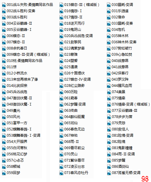 ——以上专辑均包含在内,所有文件均无损格式上传(已转换成wav格式)。PS:曾经不小心下到仙二那张专辑的伪音轨,气死我了~还好我拿鉴定工具查过了~大家都放心哈,绝对是正版的音轨,有的还是我自己的碟子……专辑中未包含的游戏音乐我也进行了补充,目前还没发现有遗漏的(战斗胜利和战斗失败的貌似我有的没传?),大家在下载的时候顺便帮我检查下,看看有没有遗漏、文件名命名错误(特别是OL的,我老觉得名字打错好几个,但是不懂错哪里:64:)、不能下载、压缩包被破坏等问题,因为在资源上传中有N次上传失败的经历,不保证每个资源都是完整的。找出了错误记得给我私信哈,谢谢各位了!以下放曲名,骚年们,自取所需吧~!!!!(此文由本人亲自手打,转载请注明出处,谢谢大家支持!:76:)