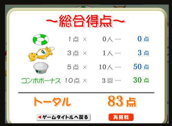 [fold=操作方法说明]鼠标操作。开始之后,点击右下角按钮或按空格键操作跳人到游泳圈和跳入大盆或玩偶上,根据速度和物品会有不同的分数,不成功的人只能下去休息,成功的还可以继续跳,所有人失败后会总结点数,试下你能跳多少点[/fold]