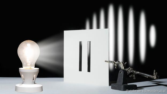 托马斯·杨在1807年描述了这个实验,把一支蜡烛放在一张开了一个小孔的纸前面,这样就形成了一个点光源(从一个点发出的光源)。现在在纸后面再放一张纸,不同的是第二张纸上开了两道平行的狭缝。从小孔中射出的光穿过两道狭缝投到屏幕上,就会形成一系列明、暗交替