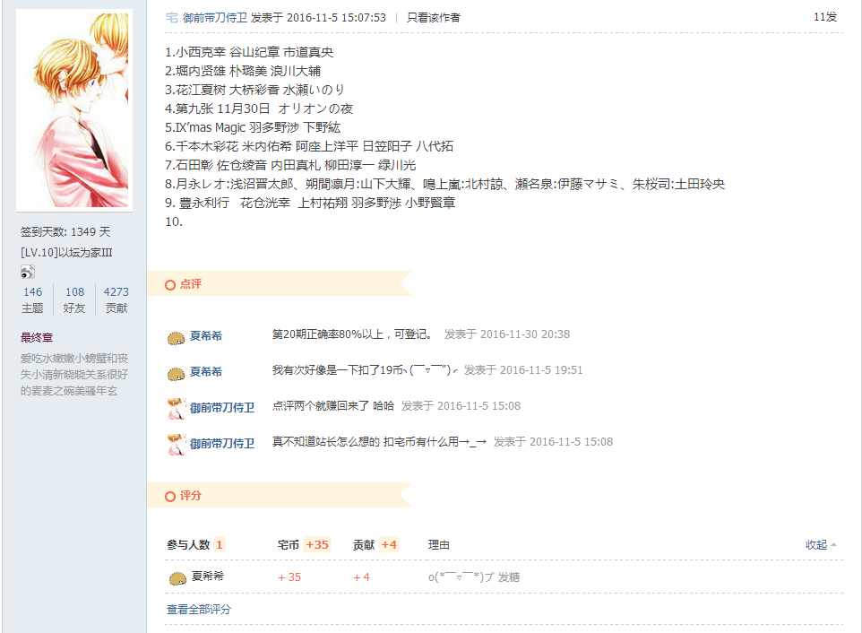 声优问答上个月和这个月的都参加了啊,那你可以用2张换上个月的全对奖励,也就是比你本来拿到的多3宅币+1 ...