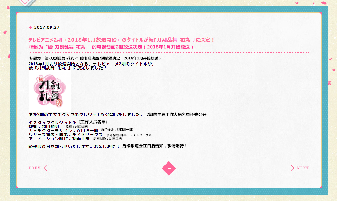 TV动画「刀剑乱舞-花丸-」第二季,将以「续『刀剑乱舞-花丸-』」为题,